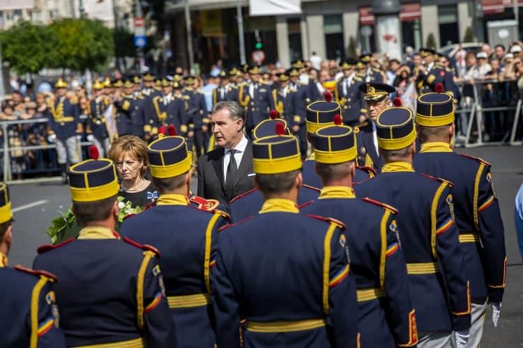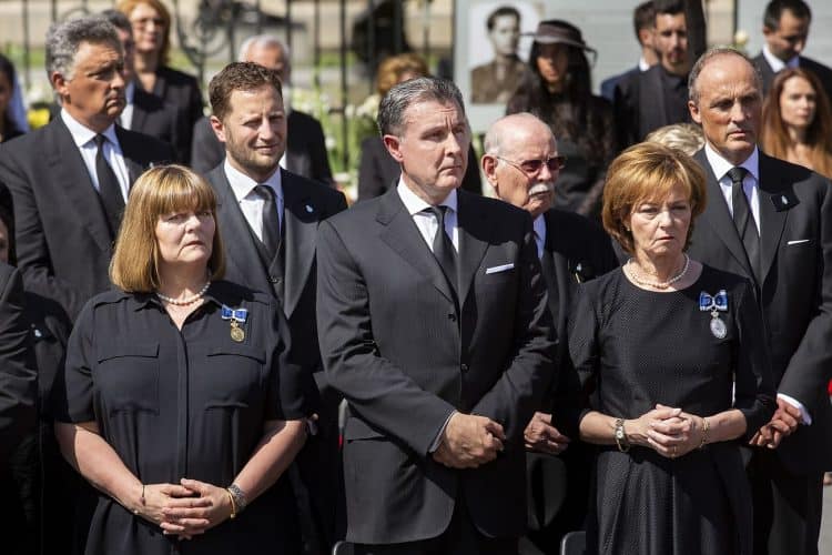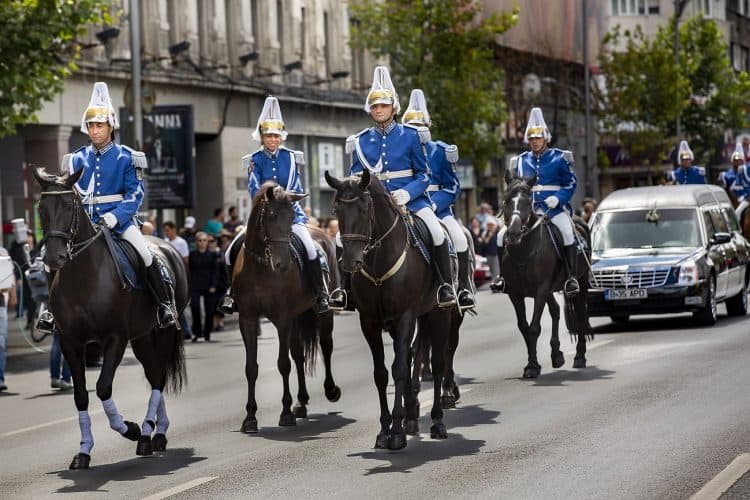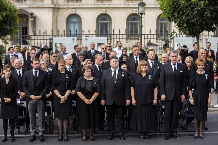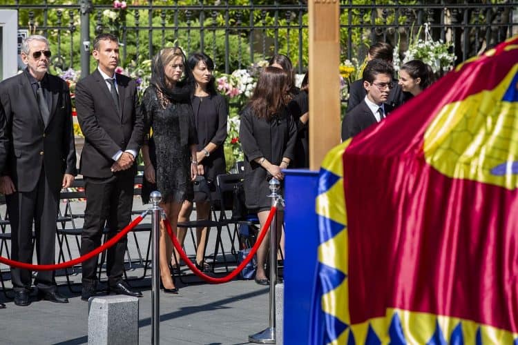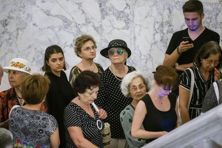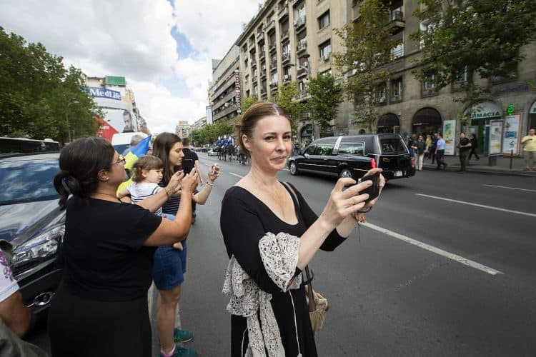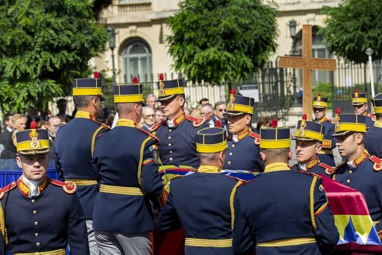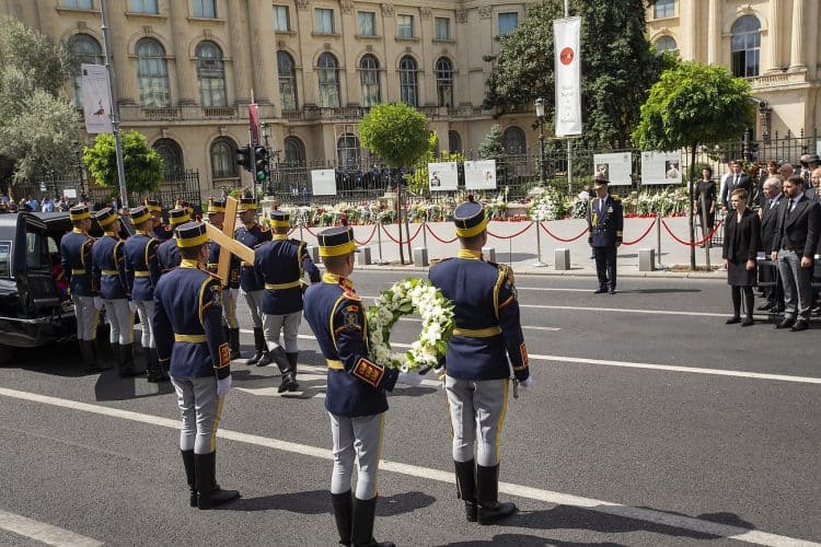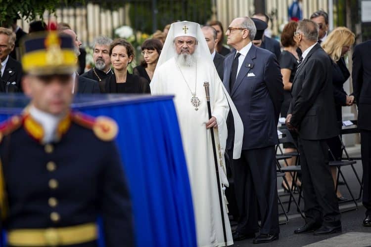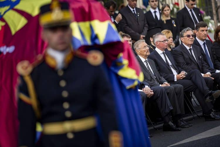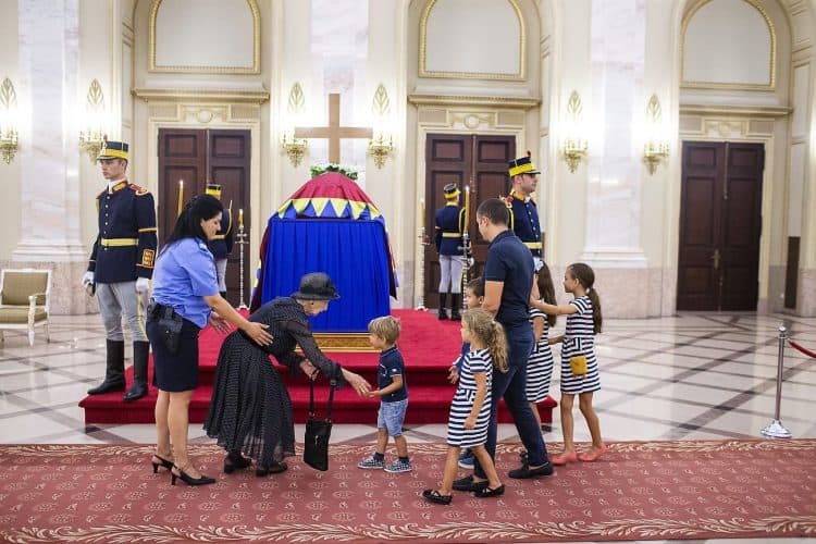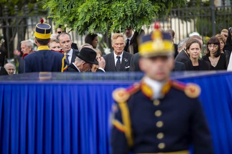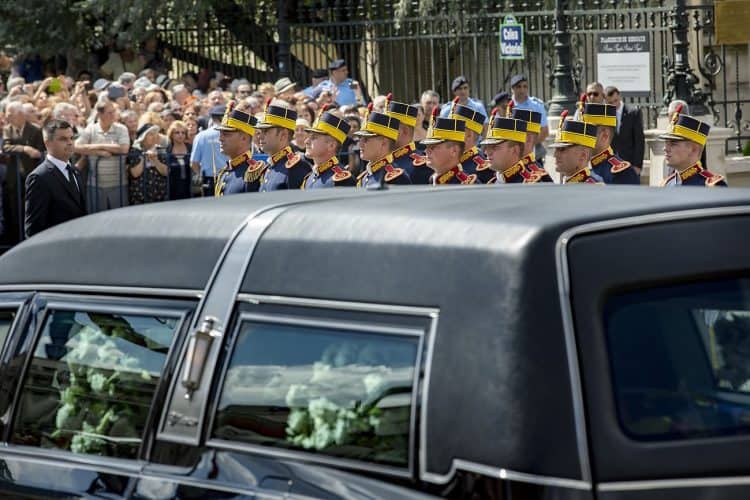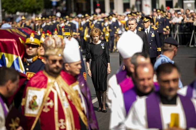 Romania, Bucharest - Aug 13: Romanian Royal family and guests pay respect to the late Queen Anne of Romania as she is moved from the Royal Palace to Curtea de Arges, the burial site for the royal family, as seen in Bucharest August 13, 2016. The body of Anne of Romania, the wife of the Romania’s former king, Michael I of Romania, arrived in Bucharest Tuesday for the royal funeral. Photography by Mugur Varzariu/Getty Images/Newsweek.