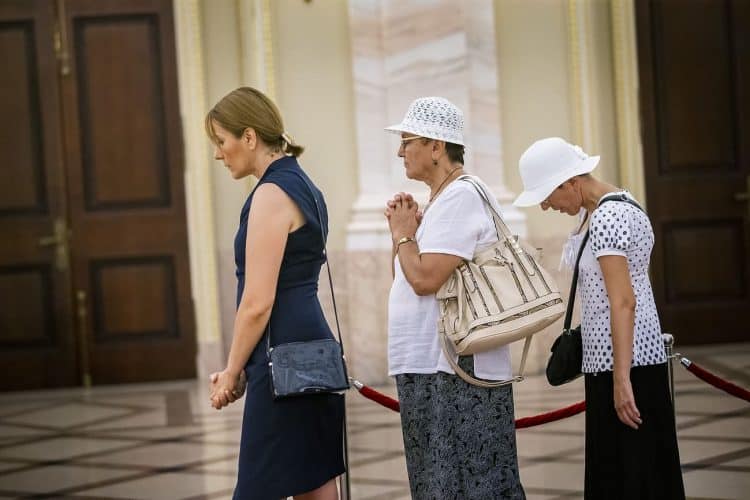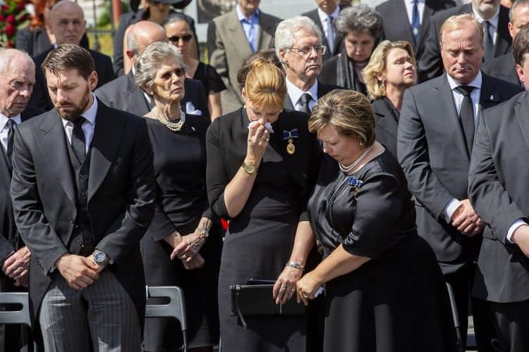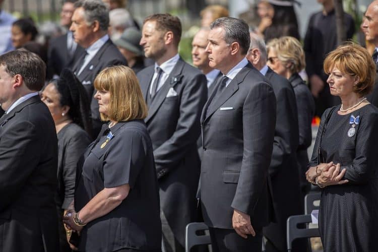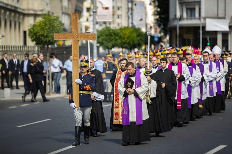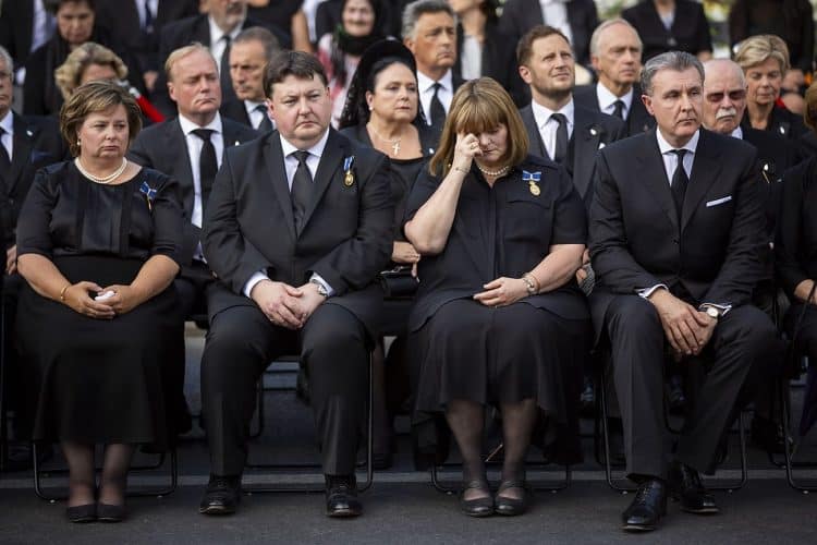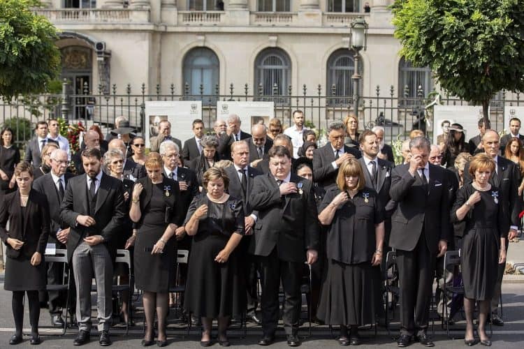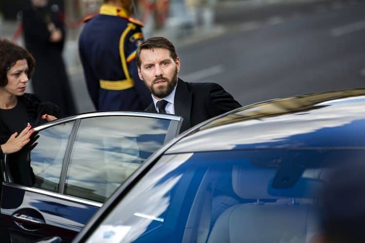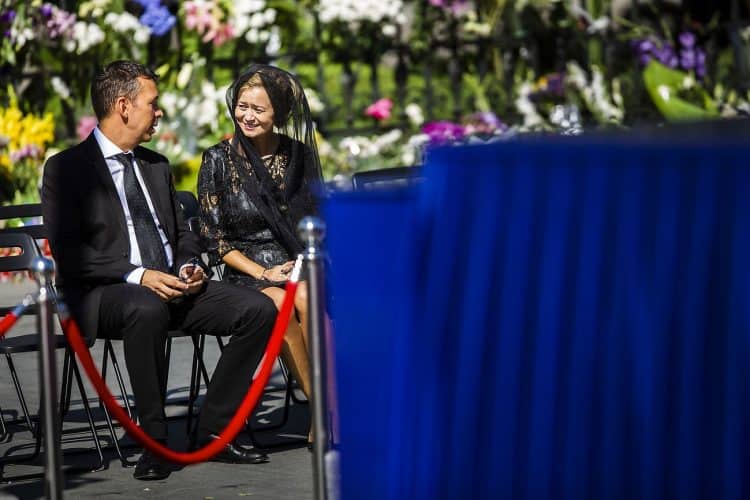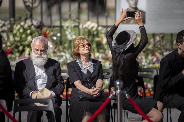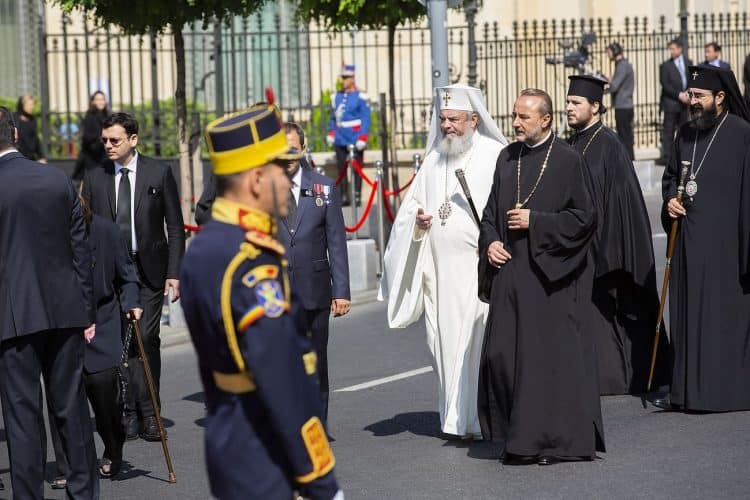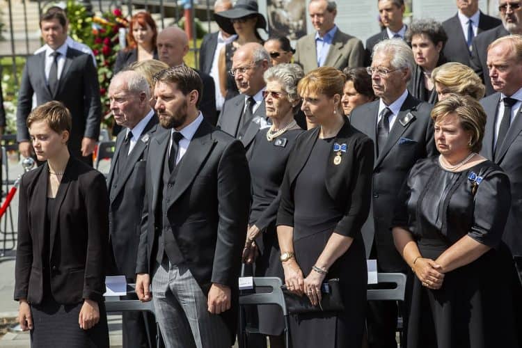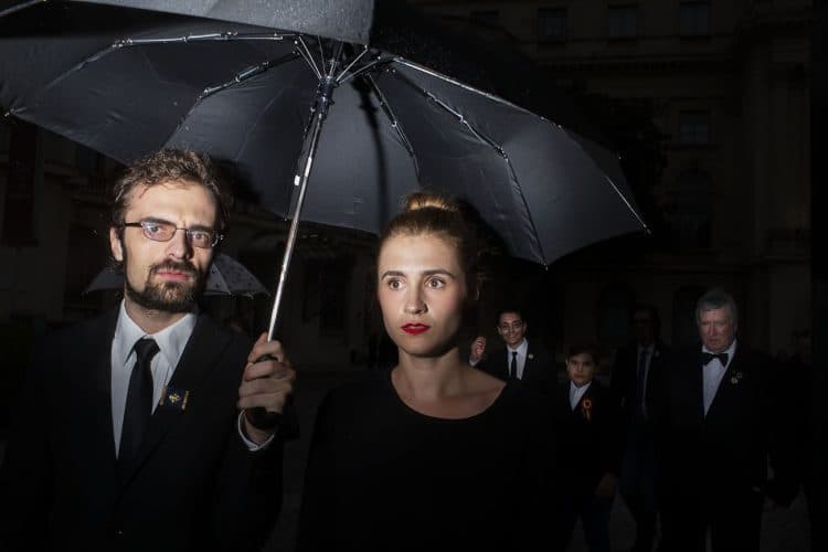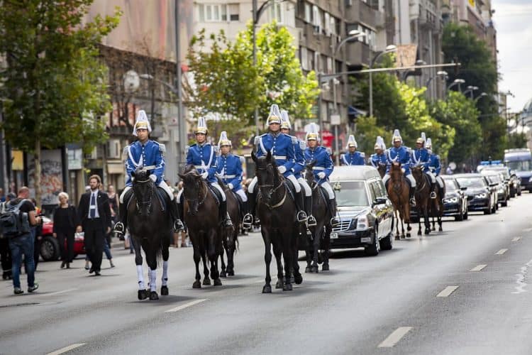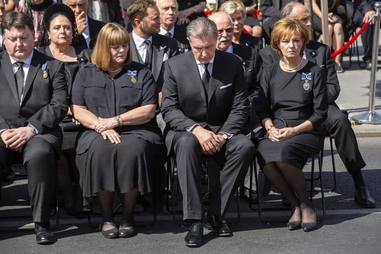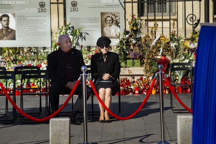 Romania, Bucharest - Aug 13: Romanian Royal family and guests pay respect to the late Queen Anne of Romania as she is moved from the Royal Palace to Curtea de Arges, the burial site for the royal family, as seen in Bucharest August 13, 2016. The body of Anne of Romania, the wife of the Romania’s former king, Michael I of Romania, arrived in Bucharest Tuesday for the royal funeral. Photography by Mugur Varzariu/Getty Images/Newsweek.