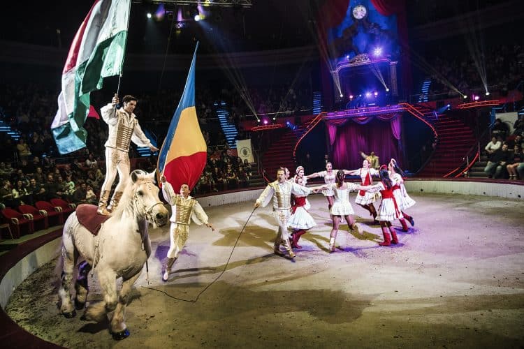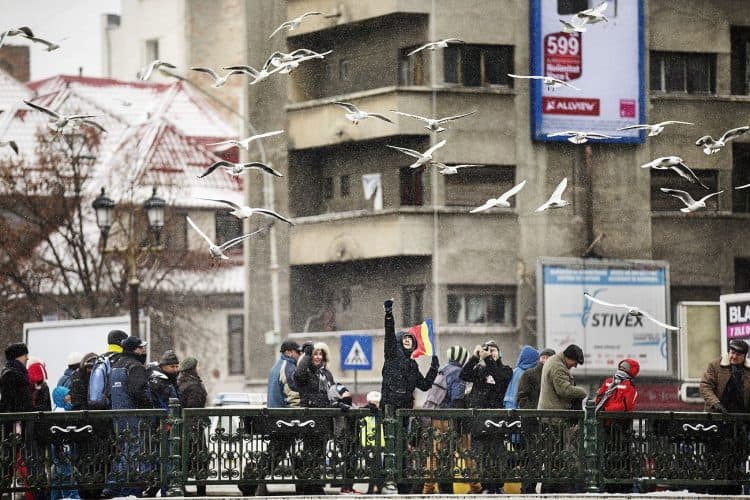 Two acrobats caring the Hungarian (L) and Romanian (R) flags as seen in Bucharest on February 19, 2017.