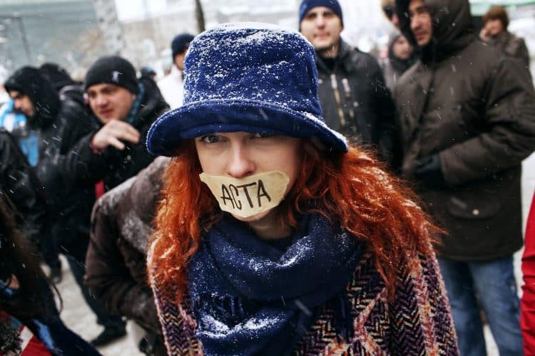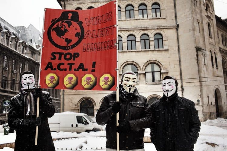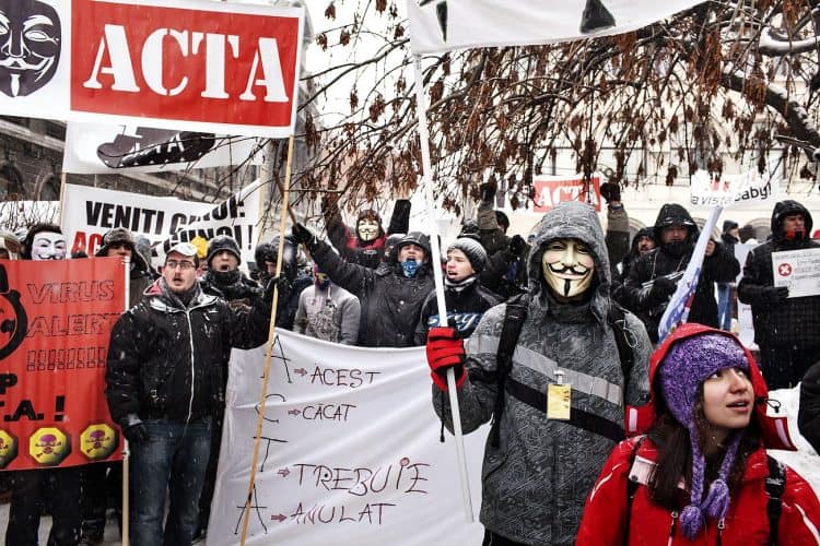 Protestors take part in a demonstration in Bucharest on February 11, 2012 to protest against the Romanian government's plan to ratify the Anti-Counterfeiting Trade Agreement (ACTA).