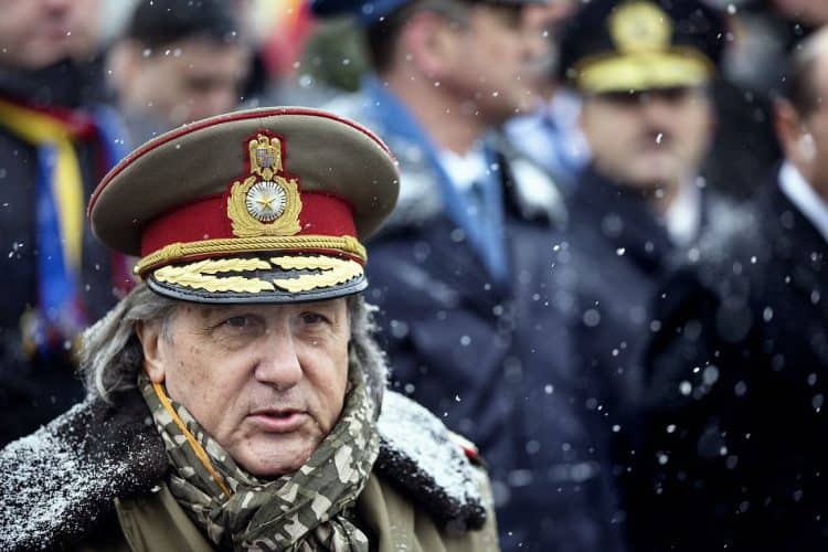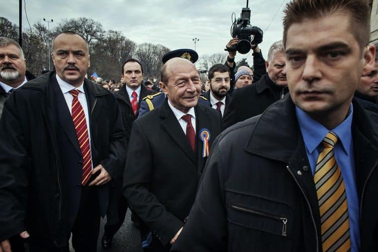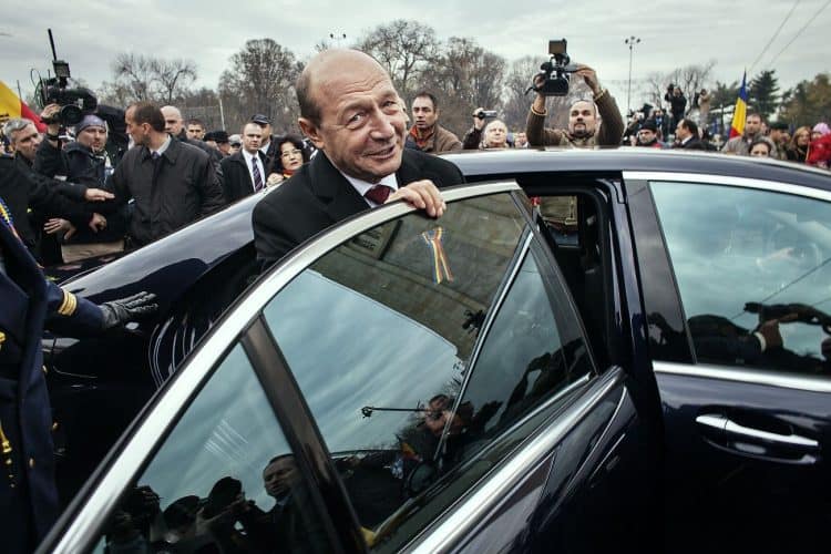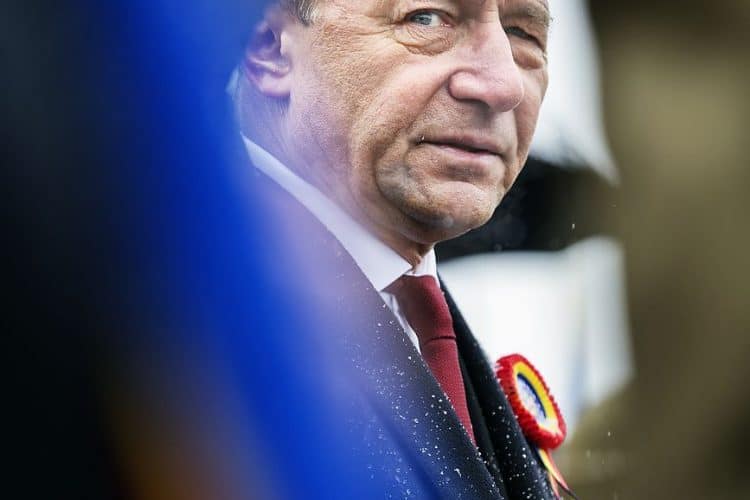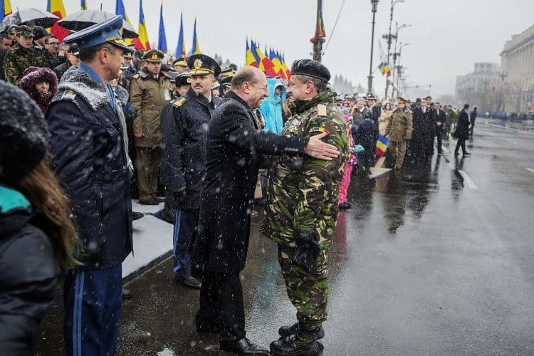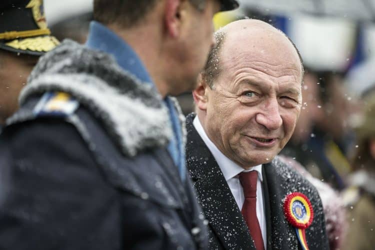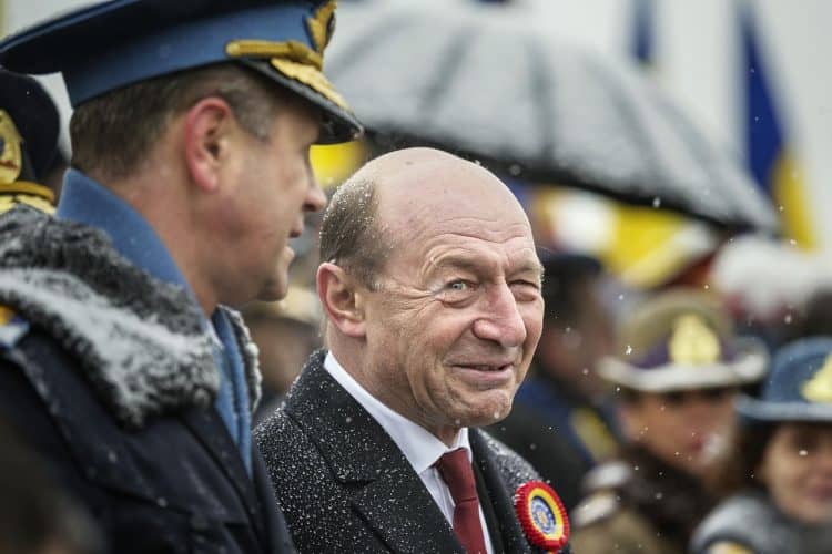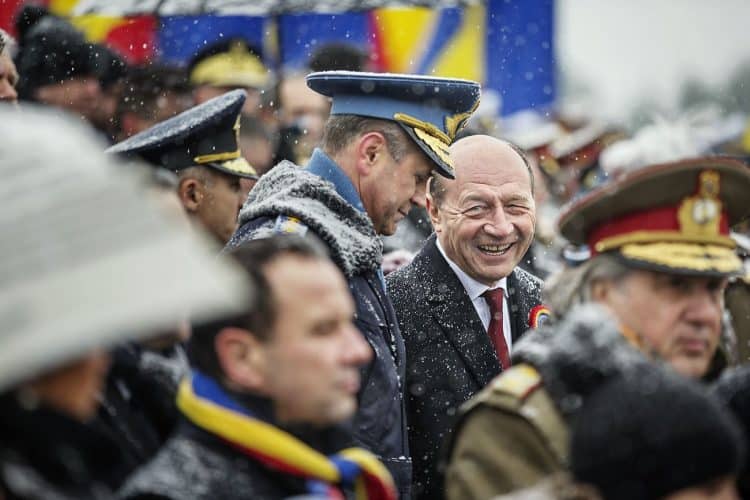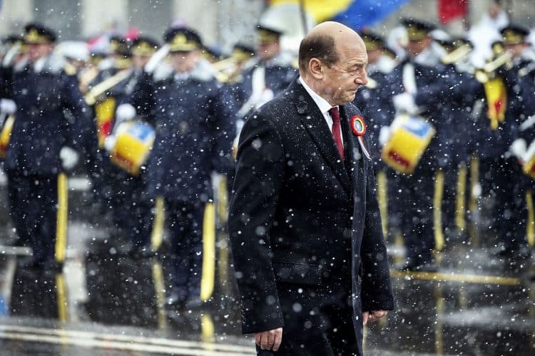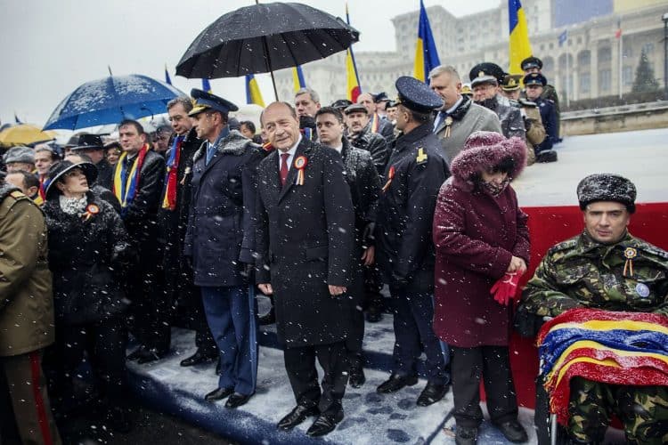 Romanian president Traian Basescu as seen during a military parade to mark Romania's national day in Bucharest, Romania, Monday, Dec. 1, 2014. Romanians braved the cold weather to watch the traditional armed forces parade, held outside the Palace of Parliament formerly the House of the People, seen in the background, built during the rule of communist dictator Nicolae Ceausescu.