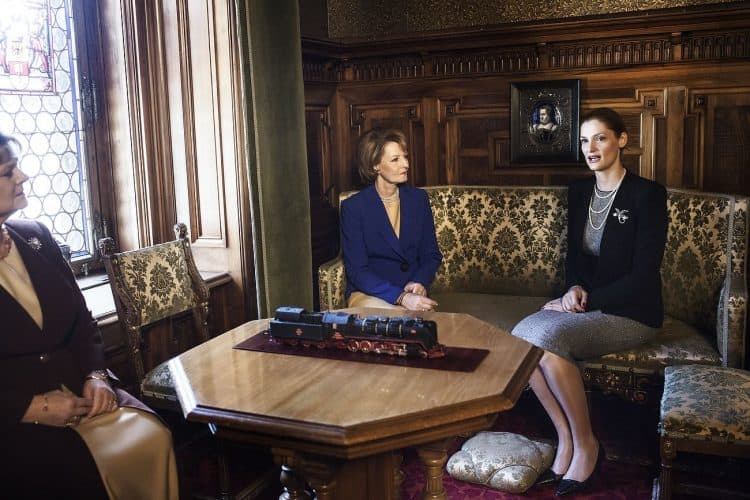 Minister of Transport Ramona Manescu (R) talking to Princess Margaret of Romania, daughter of the King of Romania Michael and her husband Prince Radu of Romania (not seen in the image) as seen in Peles Castel in Sinaia on December 1, 2013.