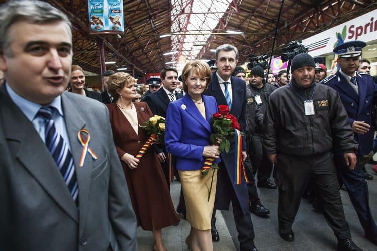 Minister of Transport Ramona Manescu (L), Princess Elena, Prince Nicolai, Princess Margaret of Romania, daughter of the King of Romania Michael and her husband Prince Radu of Romania (R) as seen in Gara de Nord on December 1, 2013, soon after their journey by Royal Train from Sinaia to Bucharest came to an end.