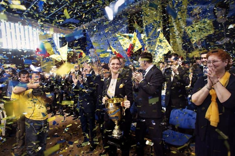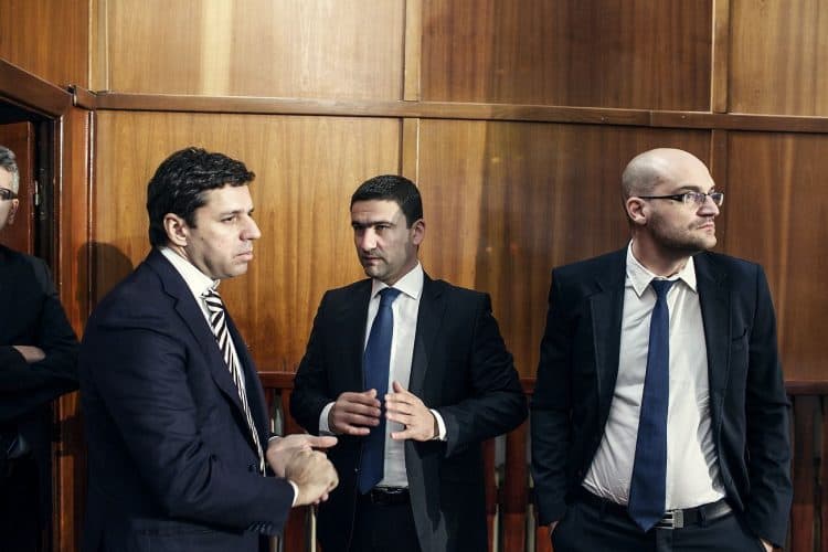 His Excellency Matthijs van Bonzel, the Dutch Ambassador in Romania (middle) and other Dutch football fans react while watching the match between Spain and Netherlands at a bar in Bucharest, Friday 13, 2014. The match was won by Netherlands by 5 to 1.