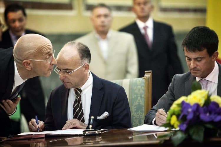 French Interior Minister Manual Valls, right, and European Affairs Minister Bernard Cazeneuve sign bilateral agreements regarding the Roma in Bucharest, Romania Wednesday, Sept. 12, 2012. Valls is on a two-day official visit to Romania to discuss with Romanian authorities the issue of Roma immigration to France.