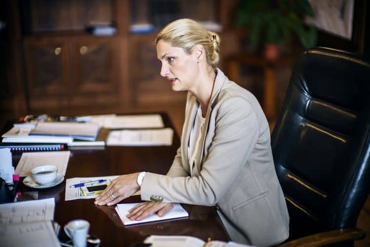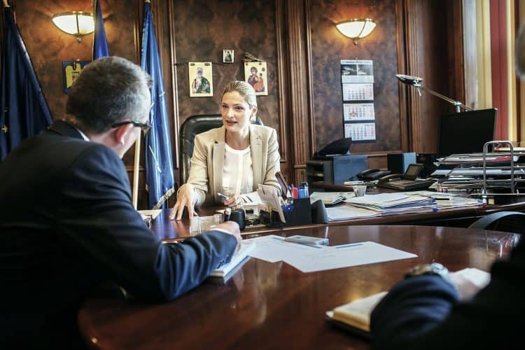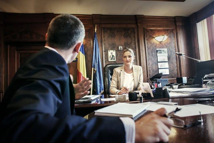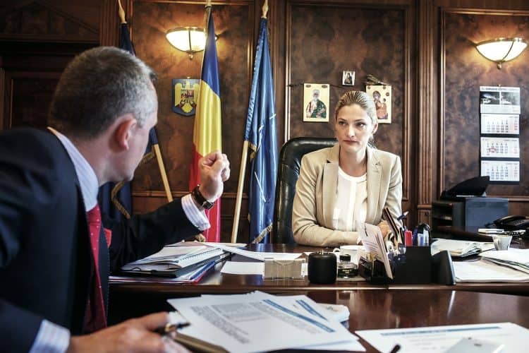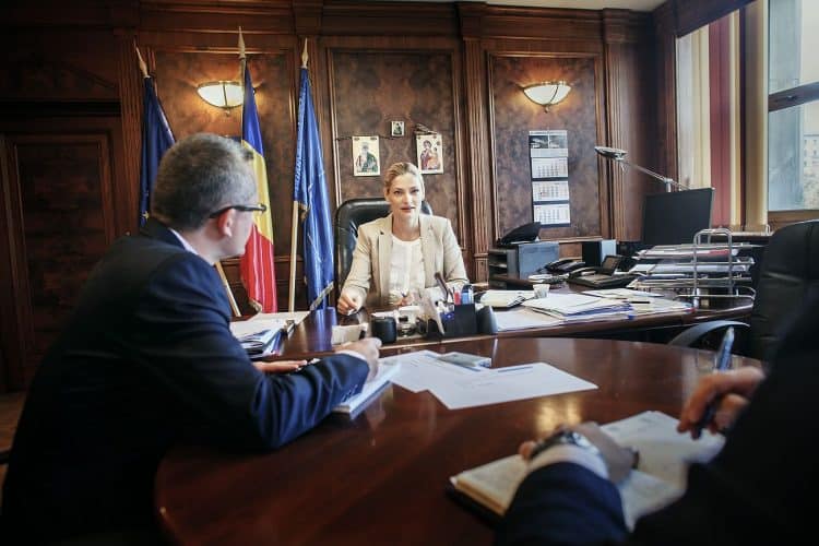 Minister of Transport Ramona Manescu (R) talking to a consultant as seen inside her office on September 17, 2013.