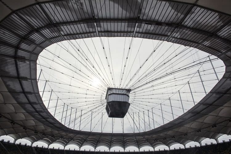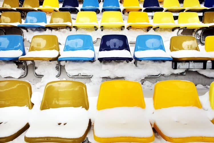 Inmates (not seen) from Jilava prison help dispose the snow on Romanian National Arena in preparations for the football match between Steaua Bucharest and Twente, as seen in Bucharest on February 7, 2012.