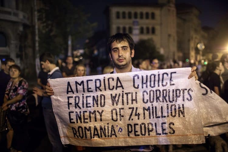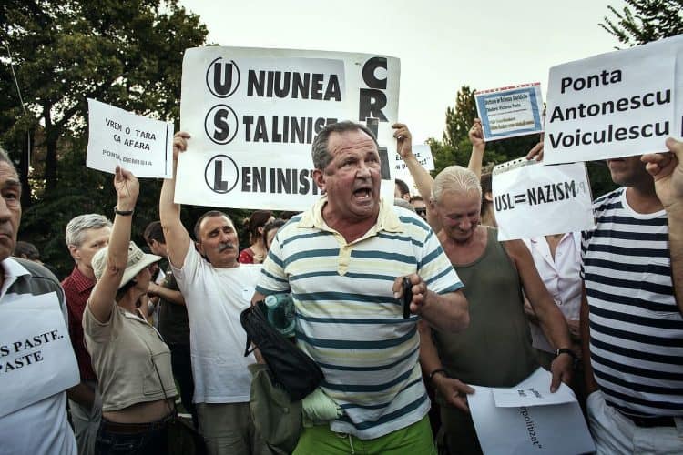 People take part in the protests accusing Romania's prime minister Victor Ponta of copying large swathes of his doctoral thesis without proper attribution, as seen in Bucharest on July 3, 2012.