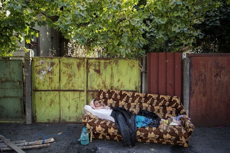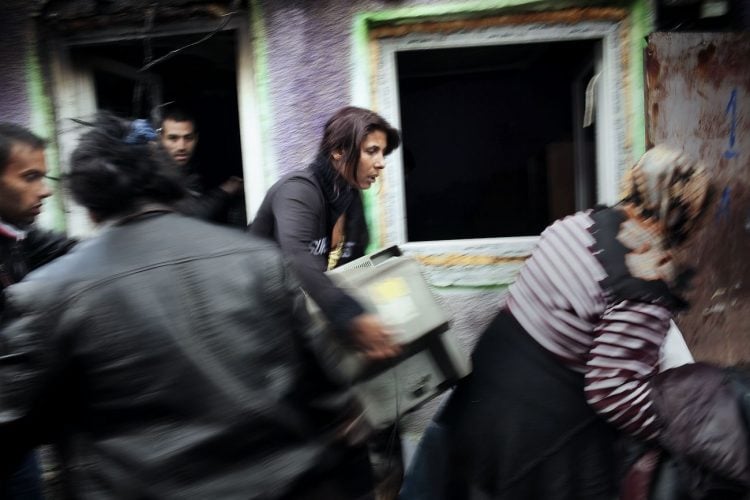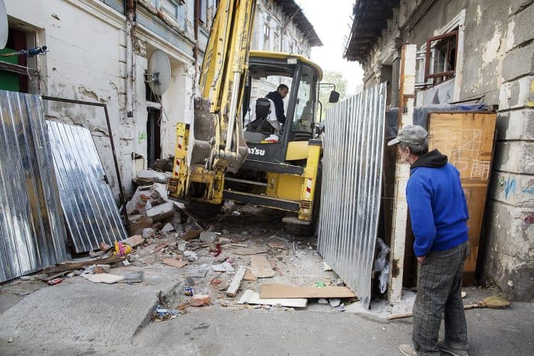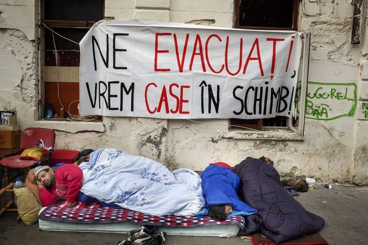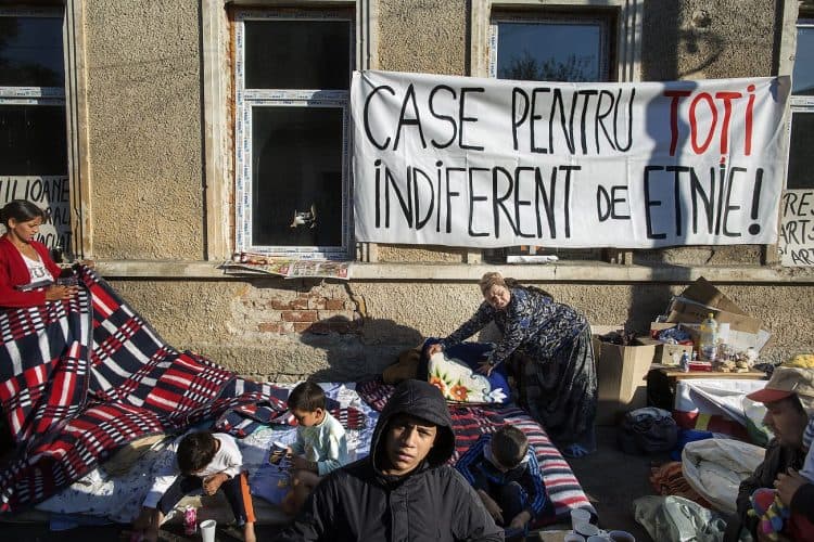BUCHAREST, ROMANIA – SEPTEMBER 16: Around 25 Romanian families of Roma origins were forcibly evicted from a formerly nationalized building whose property rights have been restored to their rightful owners, and thrown on the streets of the Romanian capital, Bucharest on September 16, 2014. The activity of providing housing focuses mainly on providing social housing for evicted tenants in previous years. According to the list of criteria developed by local authorities (as responsibility for providing social housing rests with local authorities), it is clear that the Roma as a group are excluded from eligibility to social housing, and are not the main beneficiaries of social housing provisions as a result.