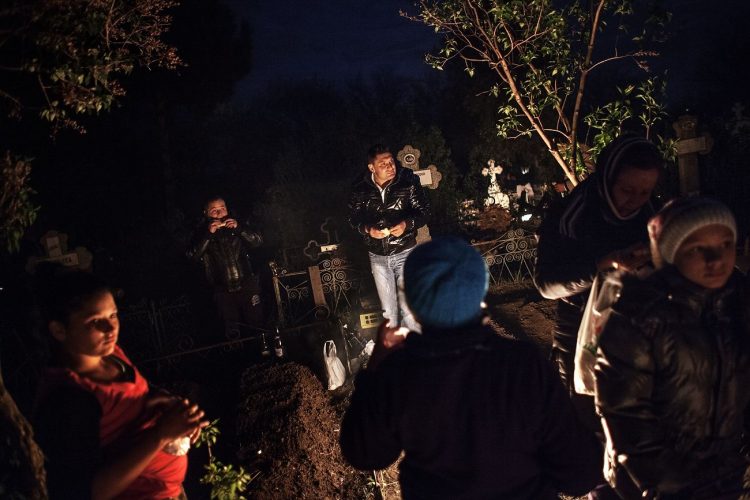 Romanians of Roma origins visit a cemetery during a Palm Sunday memorial for the departed in Tunari, North of Bucharest, early Sunday , April 8, 2012. Orthodox believers in the village gather at midnight, light fires at the graves and share food in memory of their dead relatives.