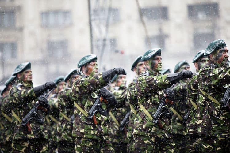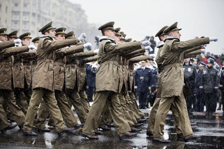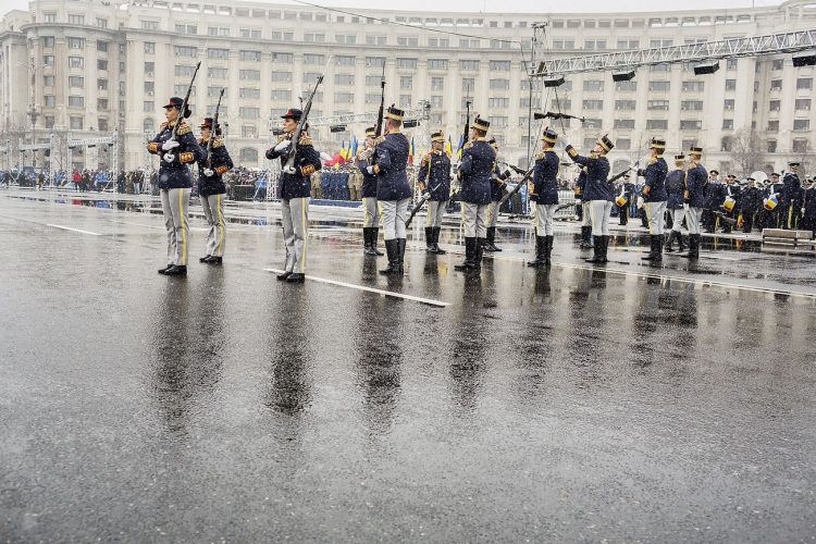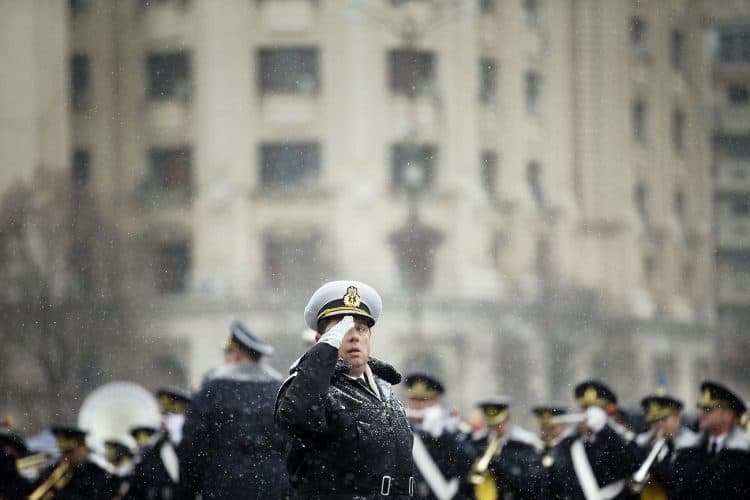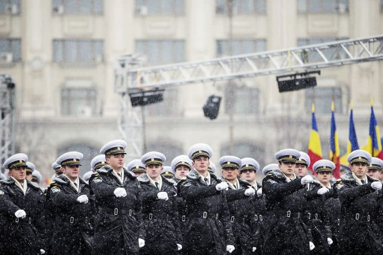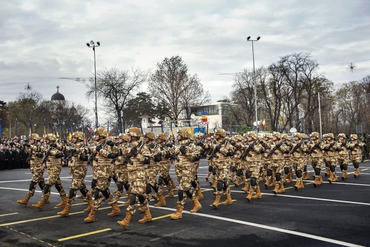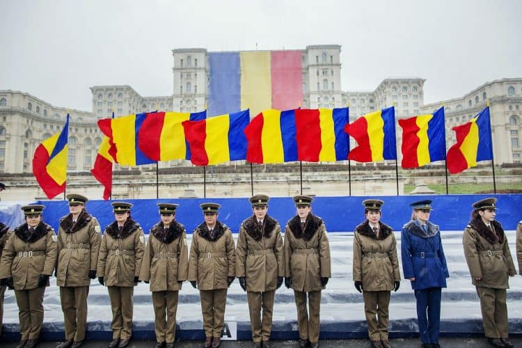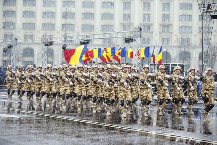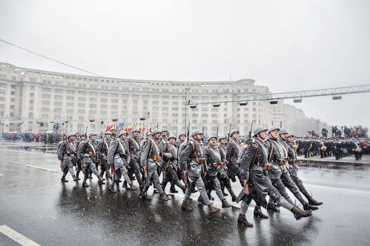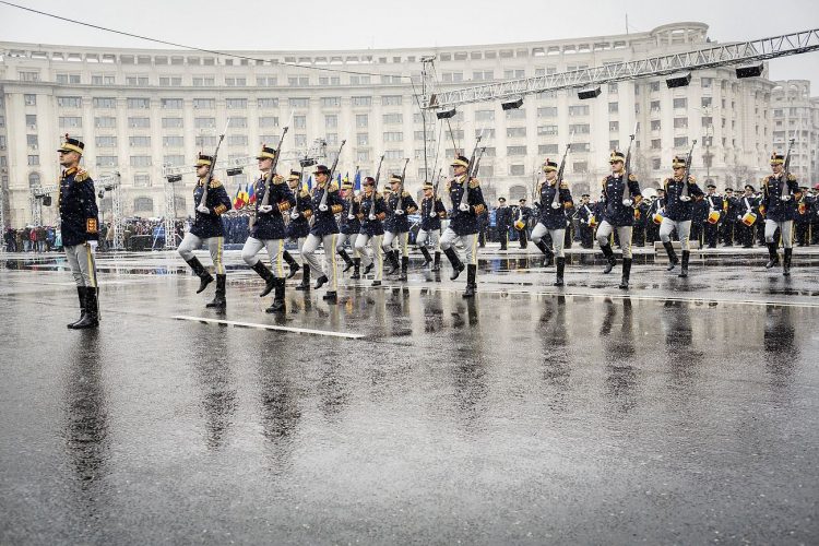 Romanian soldiers march during a military parade to mark Romania's national day in Bucharest, Romania, Monday, Dec. 1, 2014. Romanians braved the cold weather to watch the traditional armed forces parade, held outside the Palace of Parliament formerly the House of the People, seen in the background, built during the rule of communist dictator Nicolae Ceausescu.