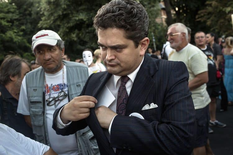 Theodor Paleologu takes part in the protests accusing Romania's prime minister Victor Ponta of copying large swathes of his doctoral thesis without proper attribution, as seen in Bucharest on July 3, 2012.