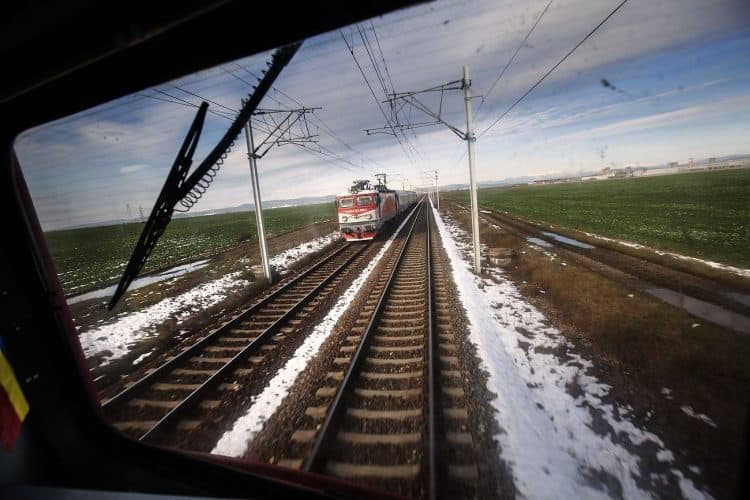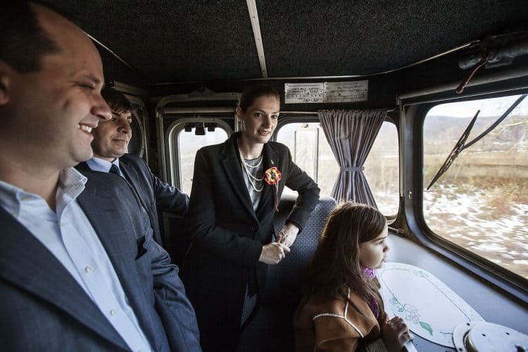 Minister of Transport Ramona Manescu (not seen) ridding the locomotive from Campina to Comarnic on her way to meet with Princess Margaret of Romania, daughter of the King of Romania Michael and her husband Prince Radu of Romania, as seen on December 1, 2013.