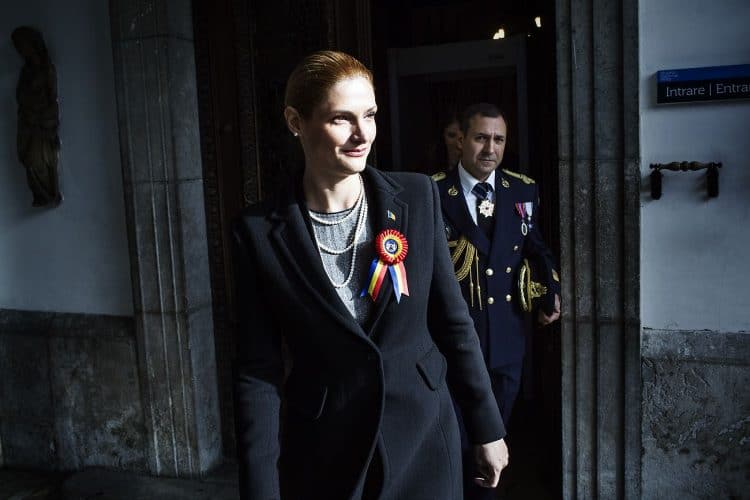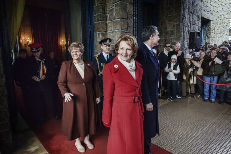 Minister of Transport Ramona Manescu exiting Peles Palace after being received by Princess Margaret of Romania, daughter of the King of Romania Michael and her husband Prince Radu of Romania (not seen in the image) as seen in Sinaia on December 1, 201