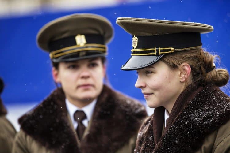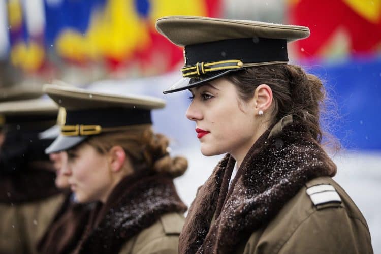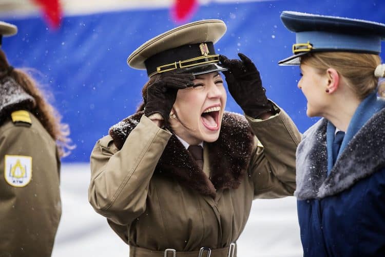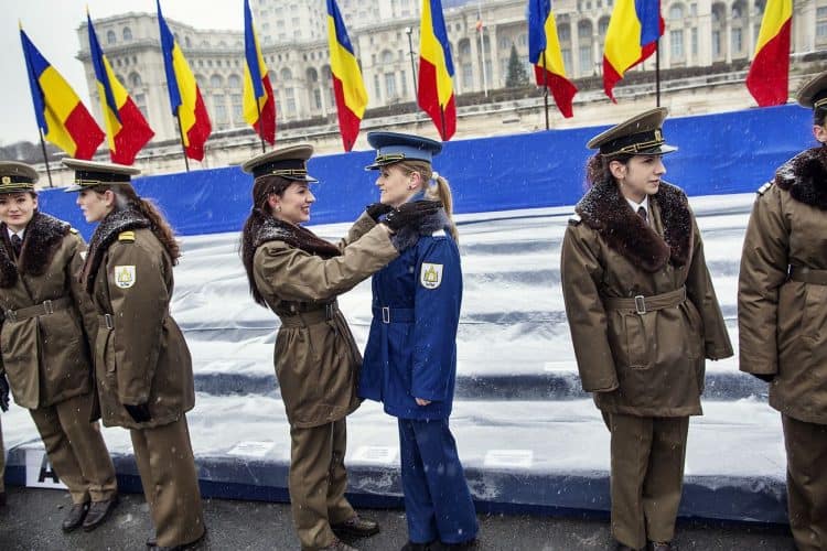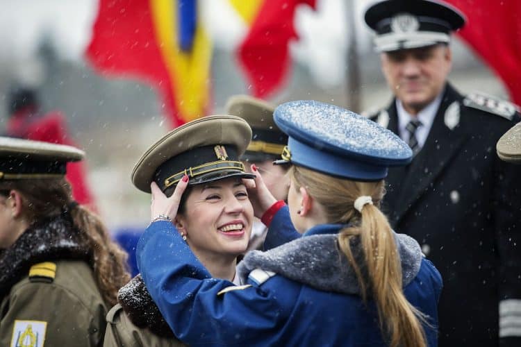 Female Romanian military personnel share a laugh before a military parade to mark Romania's national day in Bucharest, Romania, Dec. 1, 2014. Romanians braved the cold weather to watch the traditional armed forces parade, held outside the Palace of Parliament formerly the House of the People, built during the rule of communist dictator Nicolae Ceausescu.