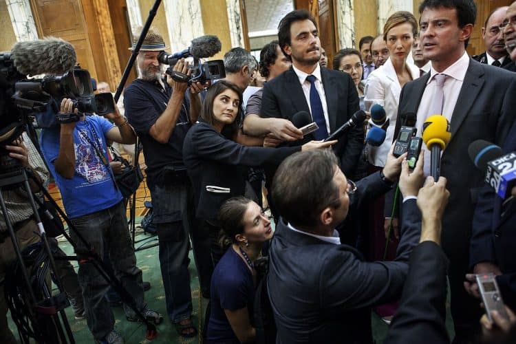 European Affairs Minister Bernard Cazeneuve and French Interior Minister Manual Valls, left, back interviewed by press after signing bilateral agreements regarding the Roma in Bucharest, Romania Wednesday, Sept. 12, 2012. Valls is on a two-day official visit to Romania to discuss with Romanian authorities the issue of Roma immigration to France.