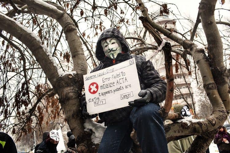 Protestors, some wearing Guy Fawkes masks, take part in a demonstration in Bucharest on February 11, 2012 to protest against the Romanian government's plan to ratify the Anti-Counterfeiting Trade Agreement (ACTA).