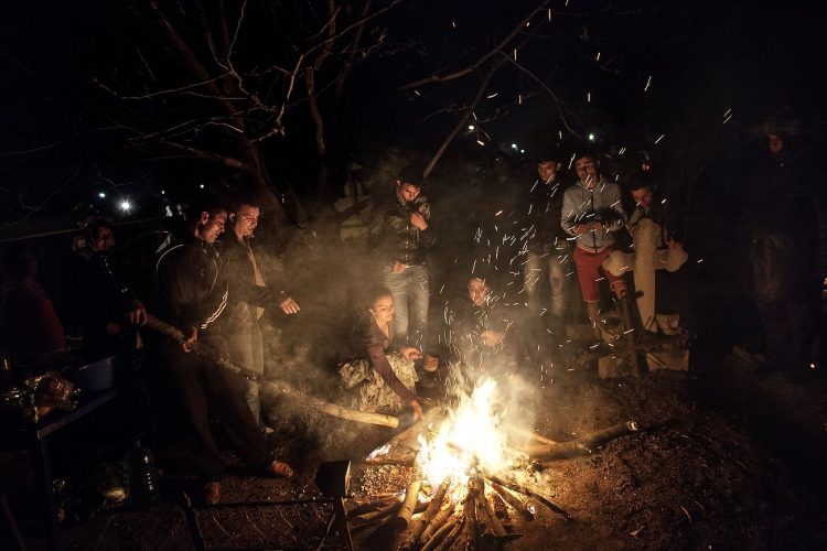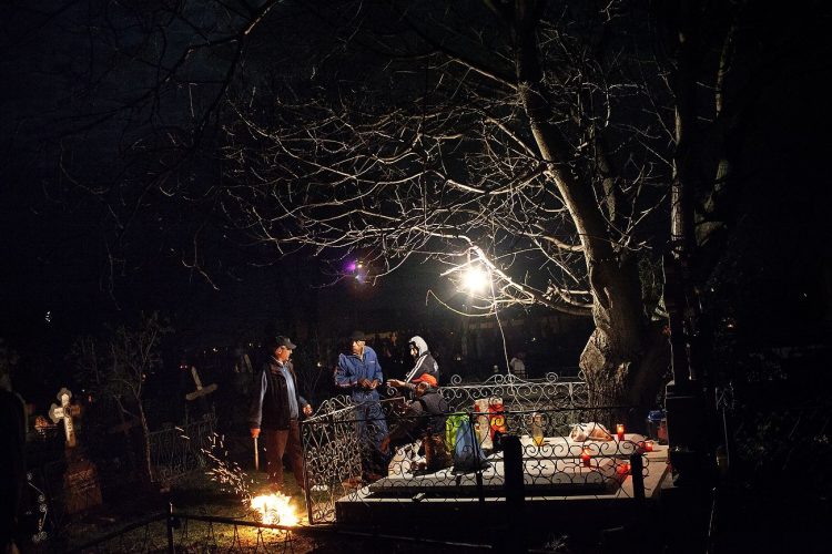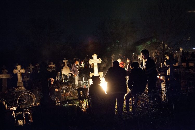 Romanians visit a cemetery during a Palm Sunday memorial for the departed in Tunari, North of Bucharest, early Sunday , April 8, 2012. Orthodox believers in the village gather at midnight, light fires at the graves and share food in memory of their dead relatives.