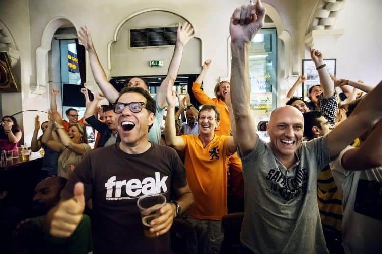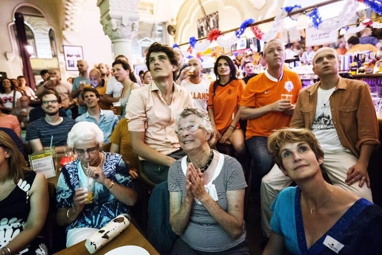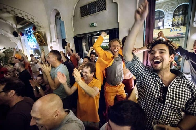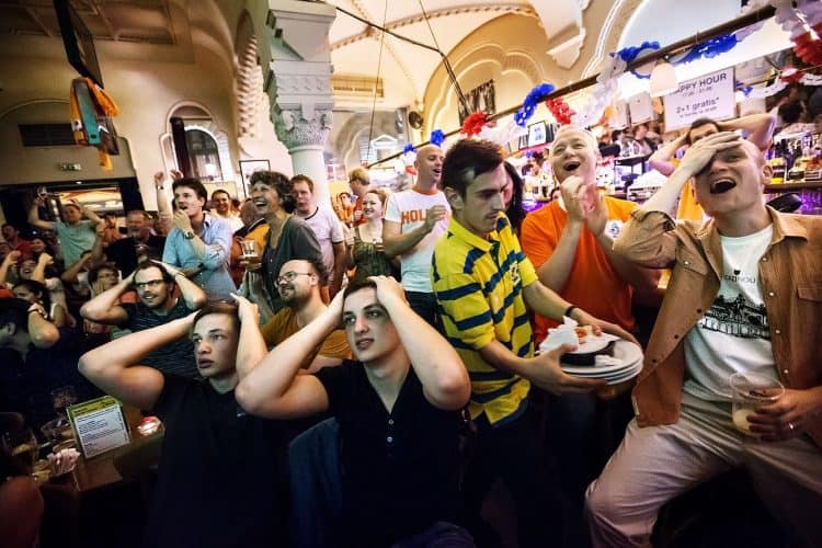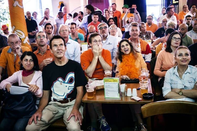 Dutch football fans react while watching the match between Spain and Netherlands at a bar in Bucharest, Friday 13, 2014. The match was won by Netherlands by 5 to 1.