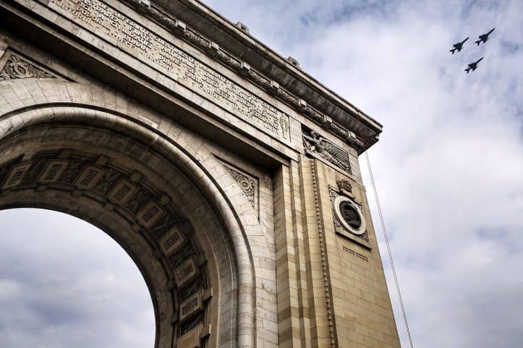 Romanian military airplanes seen flying over the Triumph Arch during ceremonies marking Romania's national day, in Bucharest, Romania, Saturday, Dec. 1, 2012.