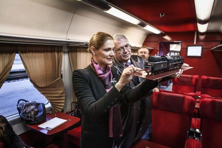 Minister of Transport Ramona Manescu talking about the locomotive replica meant as a gift for the Royal family, as seen on her way to meet with Princess Margaret of Romania, daughter of the King of Romania Michael and her husband Prince Radu of Romania, on December 1, 2013.