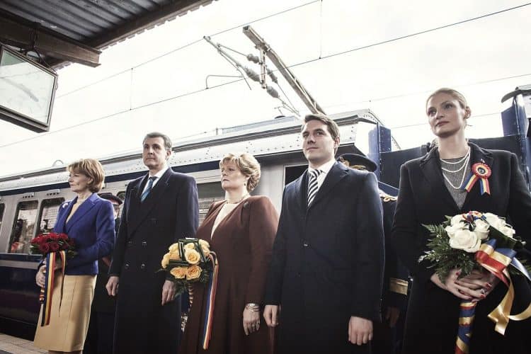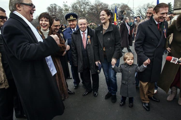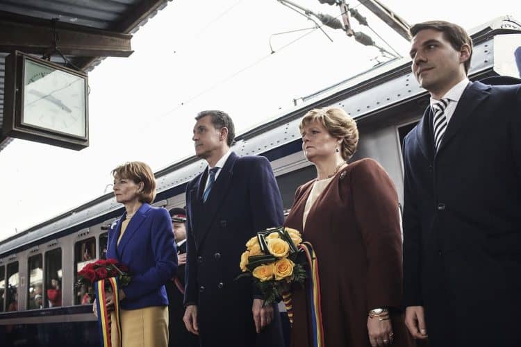 Minister of Transport Ramona Manescu (L), Prince Nicolai Princess Margaret of Romania, daughter of the King of Romania Michael and her husband Prince Radu of Romania (R) as seen in Ploiesti Vest railway station on December 1, 2013, in front of the Royal Train they all traveled by from Sinaia to Buchaest.