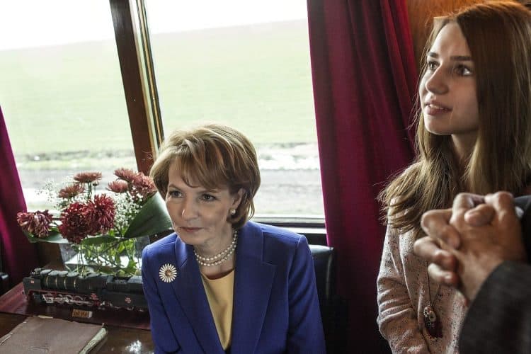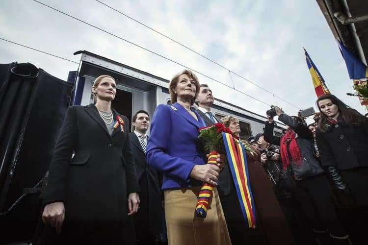Princess Margaret of Romania, daughter of the King of Romania Michael, remembering the day her family was forced to leave Romania by the very same train she was riding today, after her father Michael of Romania abdicated in favor of the government controlled by the Communist Party of Romania, as seen in the Royal Train on December 1, 2013.