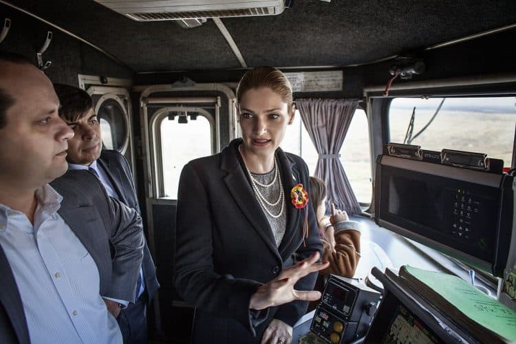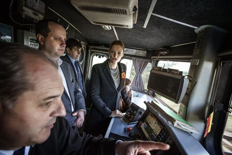 Minister of Transport Ramona Manescu ridding the locomotive from Campina to Comarnic on her way to meet with Princess Margaret of Romania, daughter of the King of Romania Michael and her husband Prince Radu of Romania, as seen on December 1, 2013.