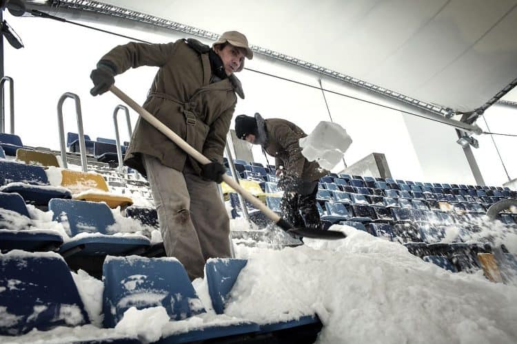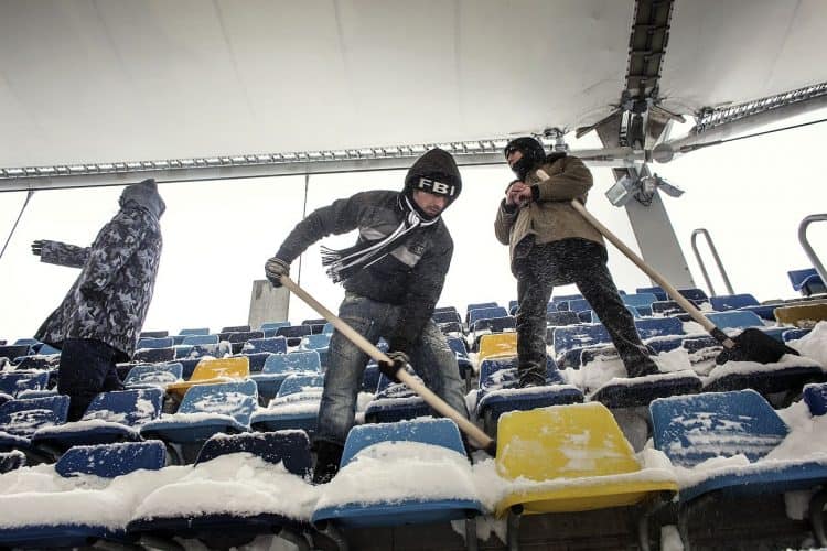Inmates from Jilava prison help dispose the snow on Romanian National Arena in preparations for the football match between Steaua Bucharest and Twente, as seen in Bucharest on February 7, 2012.