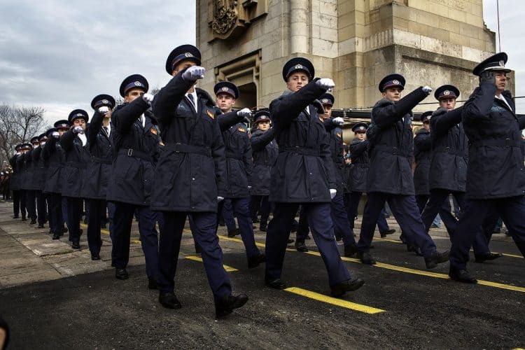 Romanian police forces march during ceremonies marking Romania's national day, in Bucharest, Romania, Saturday, Dec. 1, 2012.