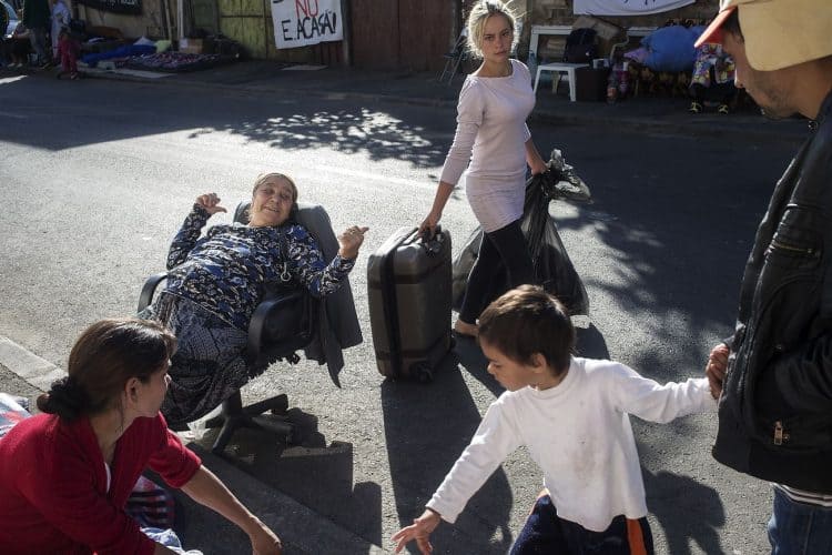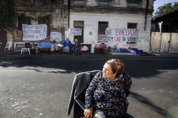 BUCHAREST, ROMANIA – SEPTEMBER 17: Around 25 Romanian families of Roma origins were forcibly evicted from a formerly nationalized building whose property rights have been restored to their rightful owners, and thrown on the streets of the Romanian capital, Bucharest on September 17, 2014, after refusing the temporary shelters involving women and children living separate from men, offered by the authorities. The activity of providing housing focuses mainly on providing social housing for evicted tenants in previous years. According to the list of criteria developed by local authorities (as responsibility for providing social housing rests with local authorities), it is clear that the Roma as a group are excluded from eligibility to social housing, and are not the main beneficiaries of social housing provisions as a result.