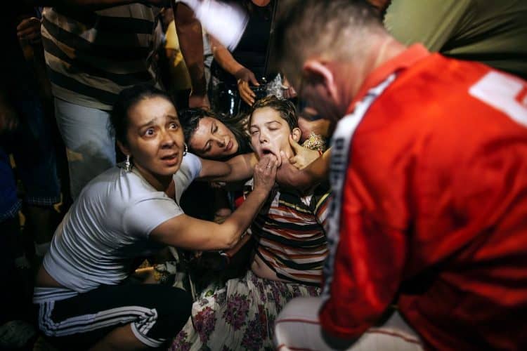 Protesters give first aid to a woman that collapsed and lost consciousness during a rally against austerity measures as seen in Piata Universitatii in Bucharest on August 22, 2012.