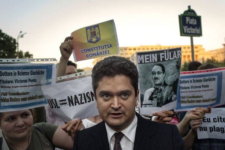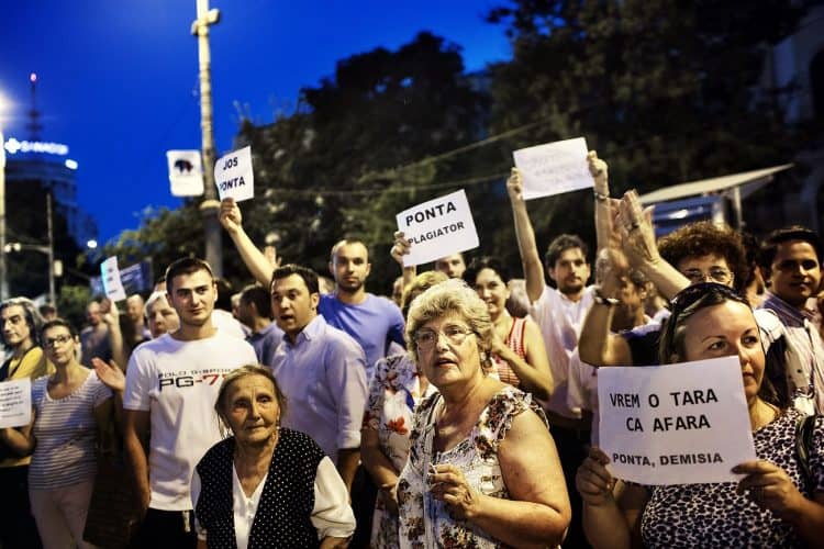 People take part in the protests accusing Romania's prime minister Victor Ponta of copying large swathes of his doctoral thesis without proper attribution.
