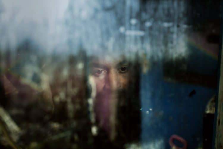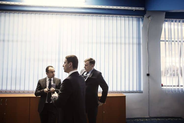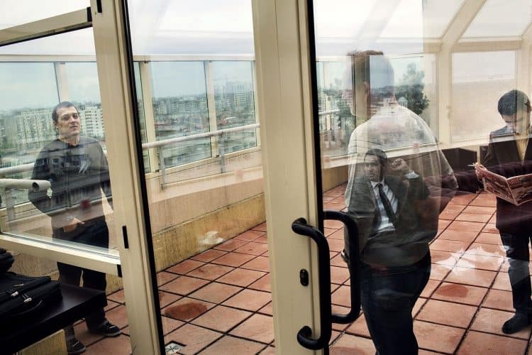 Romanian alpinist David Neacsu, white sweater, seen throughout the window on November 14, 2012 during a press conference organised by Kruk International.
