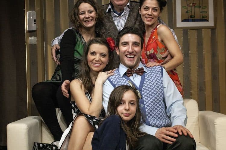 Romanian actors Andreea Sfron, Rodica Ionescu, Stefan Radof, Florentina Tilea, Silviu Biris and Andreea Maria Popescu posing for the camera after rehearsing for the opening of the comedy play 'Nobody is Perfect', directed by Radu Beligan, as seen in Bucharest on January 14, 2011.