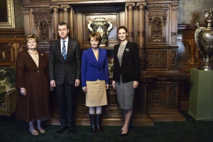 Princess Elena (L), Prince Radu of Romania, Princess Margaret of Romania, daughter of the King of Romania Michael and Minister of Transport Ramona Manescu (R) posing for the camera, as seen in Peles Castel in Sinaia on December 1, 2013.