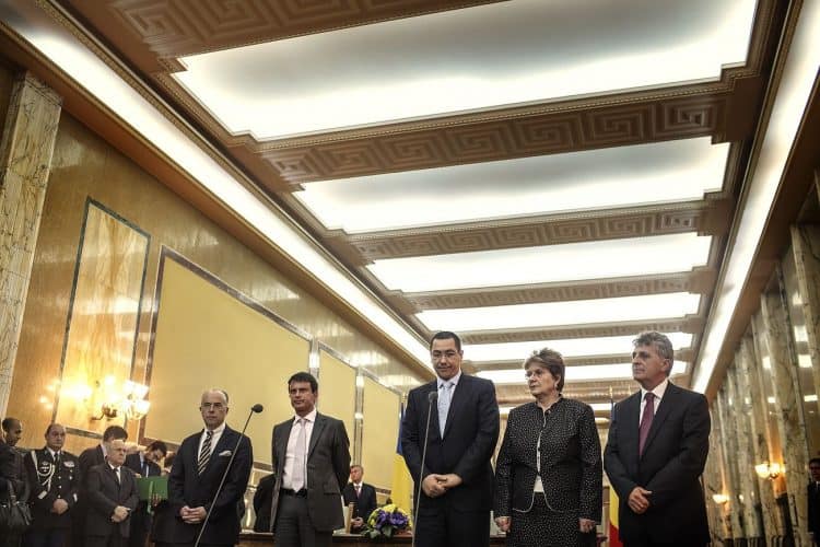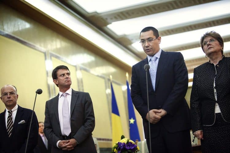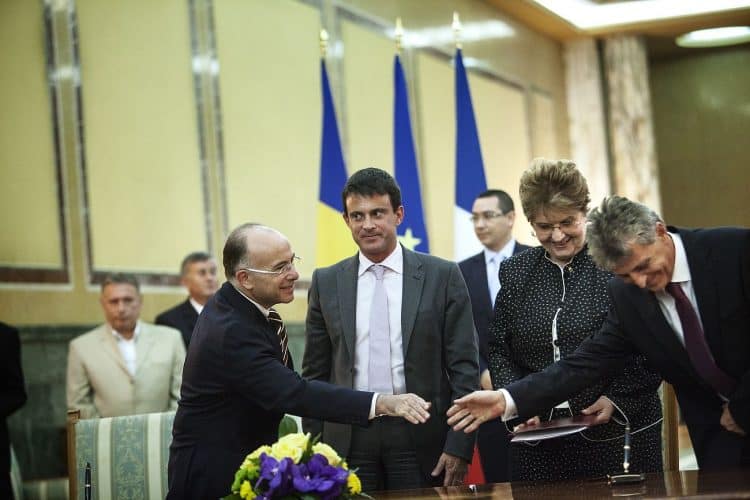 French Interior Minister Manual Valls, right, and European Affairs Minister Bernard Cazeneuve meet with the romanian counterparts for the signing of a bilateral agreements regarding the Roma in Bucharest, Romania Wednesday, Sept. 12, 2012. Valls is on a two-day official visit to Romania to discuss with Romanian authorities the issue of Roma immigration to France.