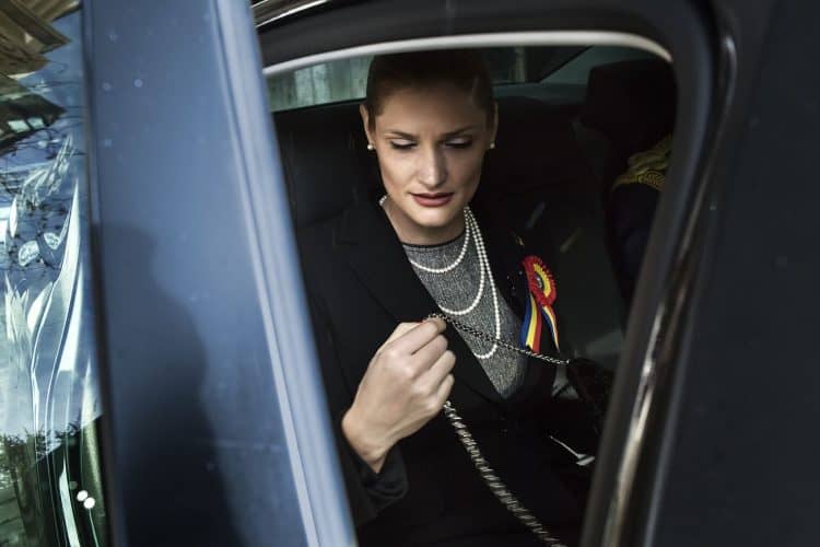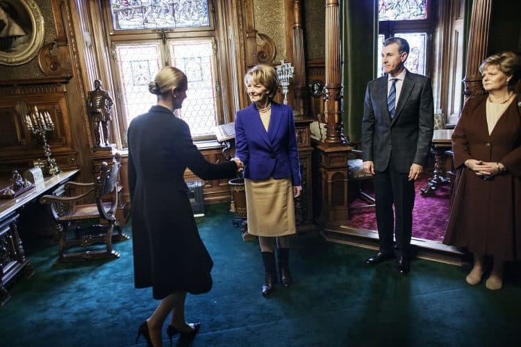 Minister of Transport Ramona Manescu leaving Peles Palace after being received by Princess Margaret of Romania, daughter of the King of Romania Michael and her husband Prince Radu of Romania as seen in Sinaia on December 1, 201