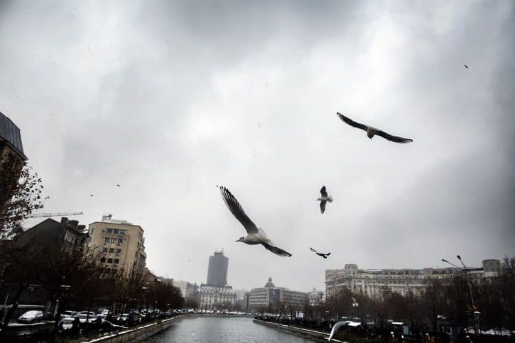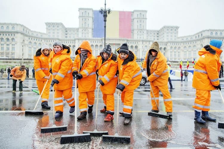 Salubrity emplyees cleaning the street prior to a a military parade to mark Romania's national day in Bucharest, Romania, Monday, Dec. 1, 2014. Romanians braved the cold weather to watch the traditional armed forces parade, held outside the Palace of Parliament formerly the House of the People, seen in the background, built during the rule of communist dictator Nicolae Ceausescu.