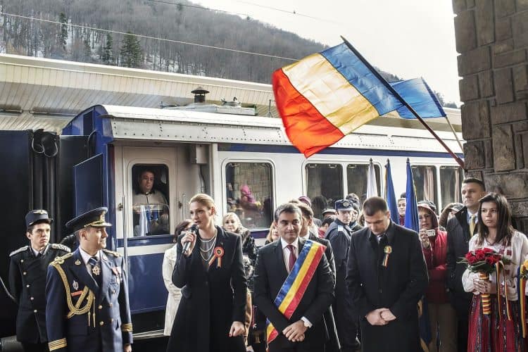 Minister of Transport Ramona Manescu addressing the royalists present at the railway station in Sinaia after being received by Princess Margaret of Romania, daughter of the King of Romania Michael and her husband Prince Radu of Romania, as seen on December 1, 2013.