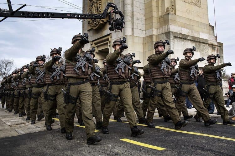 Romanian anti-terrorist troops march during ceremonies marking Romania's National Day, in Bucharest, Romania, Saturday, Dec. 1, 2012.
