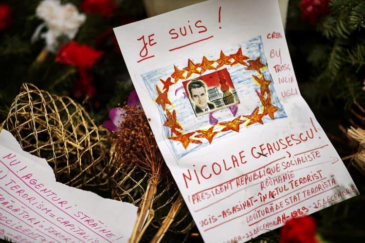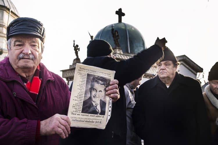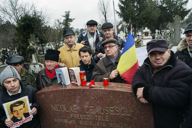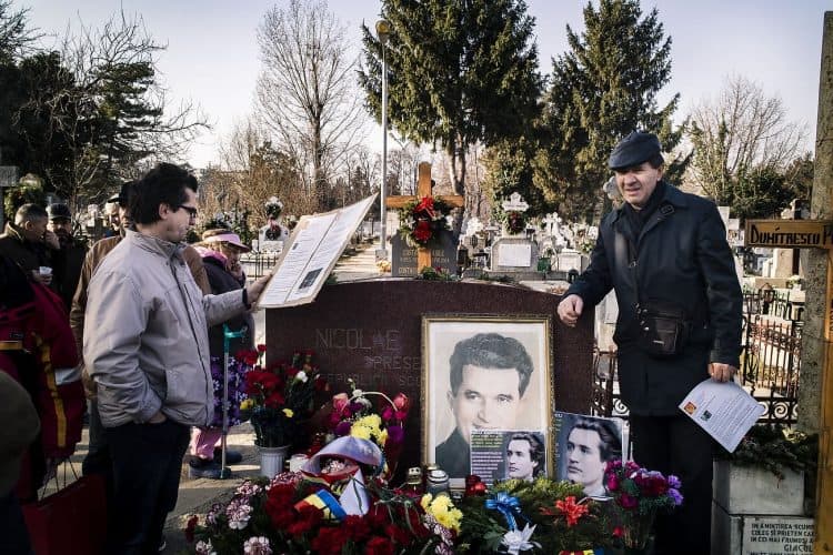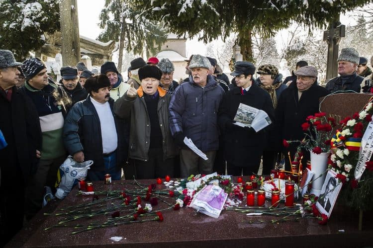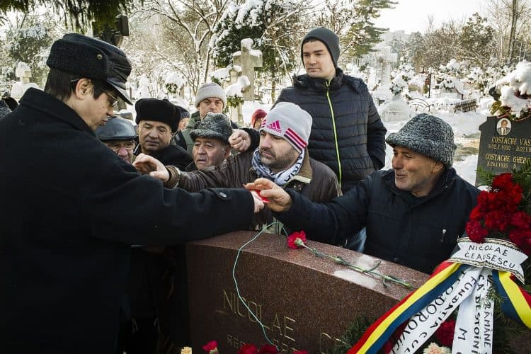 ROMANIA, Bucharest : People stand by the late Communist dictator Nicolae Ceausescu and his wife Elena's new grave at the Ghencea cemetery in Bucharest, during a commemoration of his 96th birthday, on Sunday Jan. 26 2014. The bodies of executed Romanian dictator Nicolae Ceausescu and his wife Elena were reburied late December 8, 2010 nearly five months after they were exhumed for tests to confirm their identity. Ceausescu and his wife were executed by firing squad on December 25, 1989, following an anti-communist popular uprising and summary trial. © Mugur Varzariu