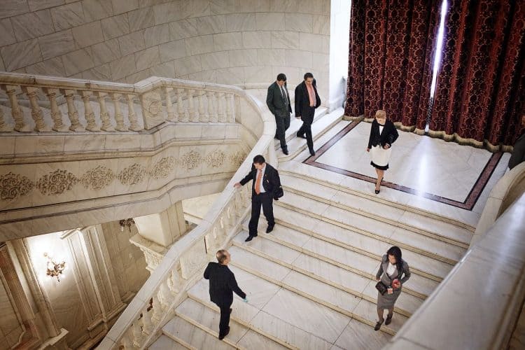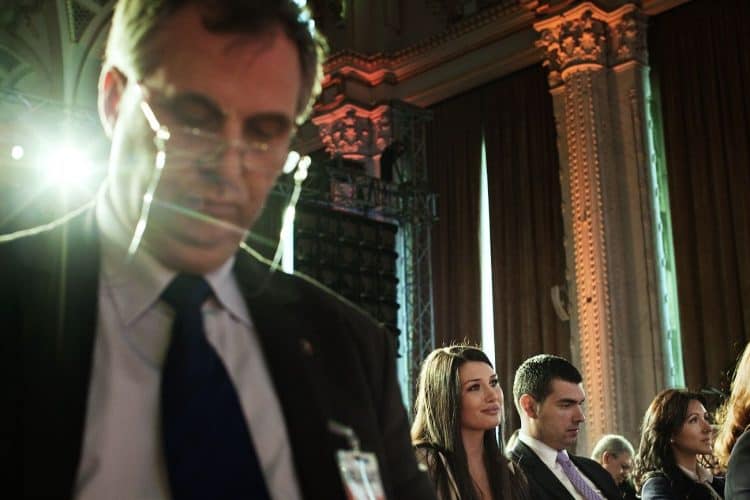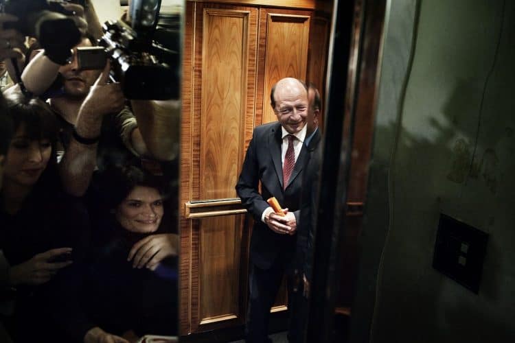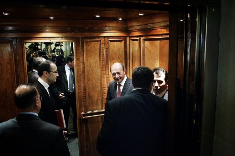 BUCHAREST, ROMANIA - MAY 19: President of Romania, Traian Basescu followed by the media, gets in the elevator at the Democratic Liberal Party National Convention in Bucharest, May 19, 2011. © Mugur Varzariu
