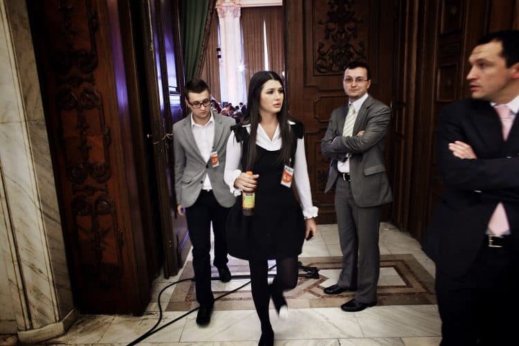 BUCHAREST, ROMANIA - MAY 19: A zealot party member passes a chair over the head of Elena Basescu, the daughter of Romanian president Traian Basescu, to let her pass, at the Democratic Liberal Party National Convention in Bucharest, May 19, 2011. © Mugur Varzariu