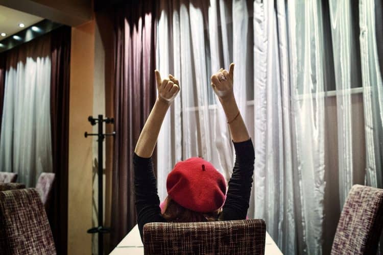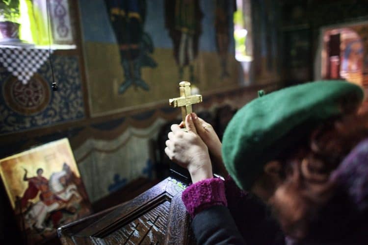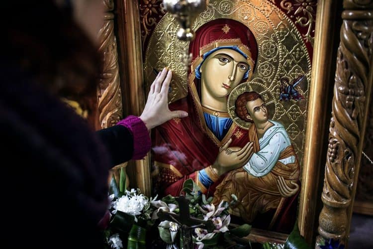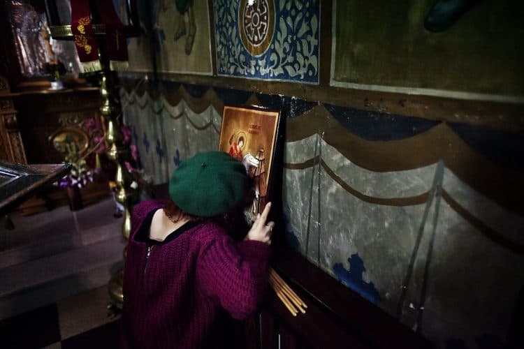 HIV positive woman seen touching an icon depicting Virgin Mary.