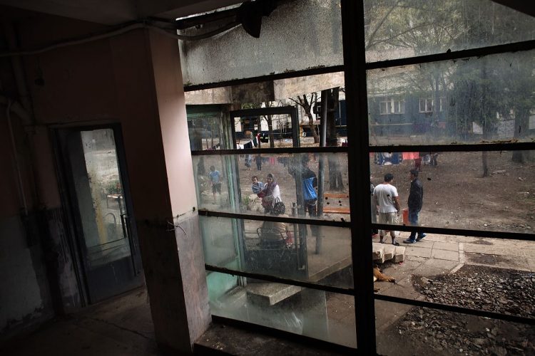 Roma people seen at Cuprom through the glass near the entrance to the third building. Most of the people at Cuprom where forcibly evicted from Craica, an informal Roma settlement in Baia Mare. Some of these settlements, like the one on Craica, date back to early 90's. They where always tolerated by the authorities who verbally encouraged Roma to build in the area while giving reassurance that nothing bad would ever happen to them. Yet, today, while campaigning on a hate ticket, the same authorities started forced evictions without other reasons than ethnic cleansing of the cities.