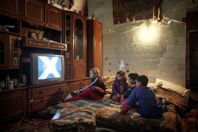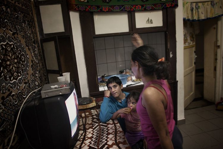Romanians of Roma origins seen watching TV inside their room at Cuprom, on October 6, 2012. Most of the people at Cuprom where forcibly evicted from Craica, an informal Roma settlement in Baia Mare. Some of these settlements, like the one on Craica, date back to early 90's. They where always tolerated by the authorities who verbally encouraged Roma to build in the area while giving reassurance that nothing bad would ever happen to them. Yet, today, while campaigning on a hate ticket, the same authorities started forced evictions without other reasons than ethnic cleansing of the cities.