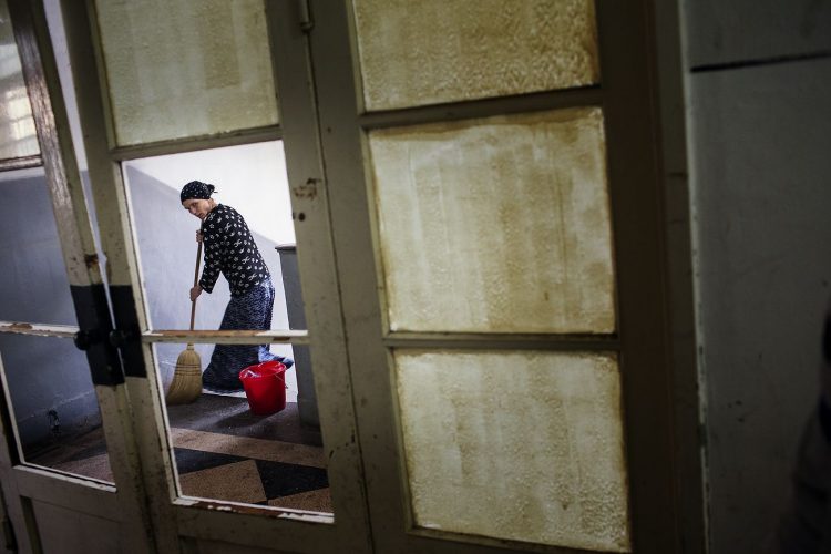 Romanian woman of Roma origins seen swiping the hallways of Cuprom, October 7, 2012. Most of the people at Cuprom where forcibly evicted from Craica, an informal Roma settlement in Baia Mare. Some of these settlements, like the one on Craica, date back to early 90's. They where always tolerated by the authorities who verbally encouraged Roma to build in the area while giving reassurance that nothing bad would ever happen to them. Yet, today, while campaigning on a hate ticket, the same authorities started forced evictions without other reasons than ethnic cleansing of the cities.Most of the people at Cuprom where forcibly evicted from Craica, an informal Roma settlement in Baia Mare. Some of these settlements, like the one on Craica, date back to early 90Õs. They where always tolerated by the authorities who verbally encouraged Roma to build in the area while giving reassurance that nothing bad would ever happen to them. Yet,Êtoday, while campaigning on a hate ticket, the same authorities started forced evictions without other reasons than ethnic cleansing of the cities.