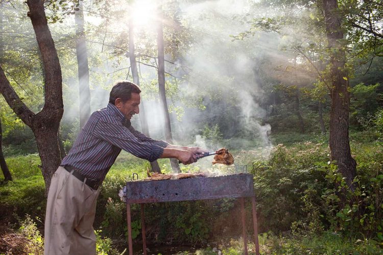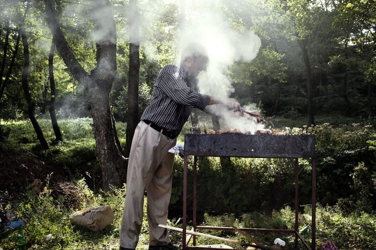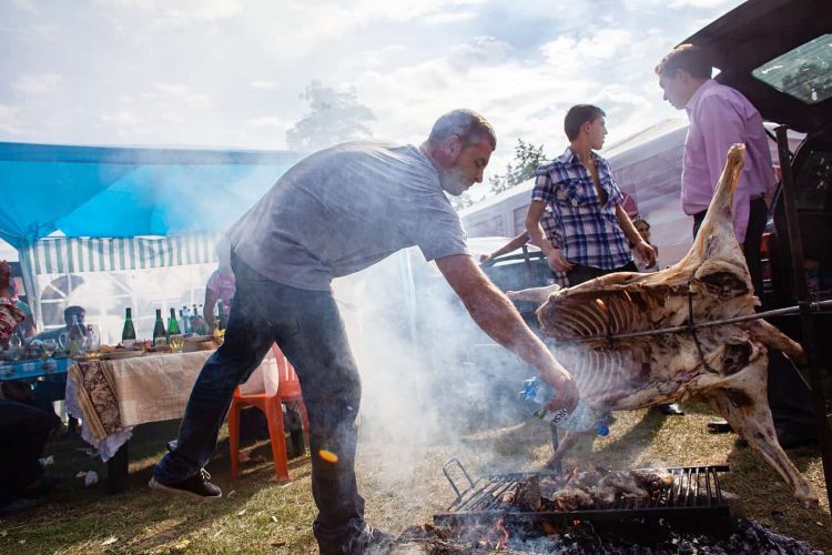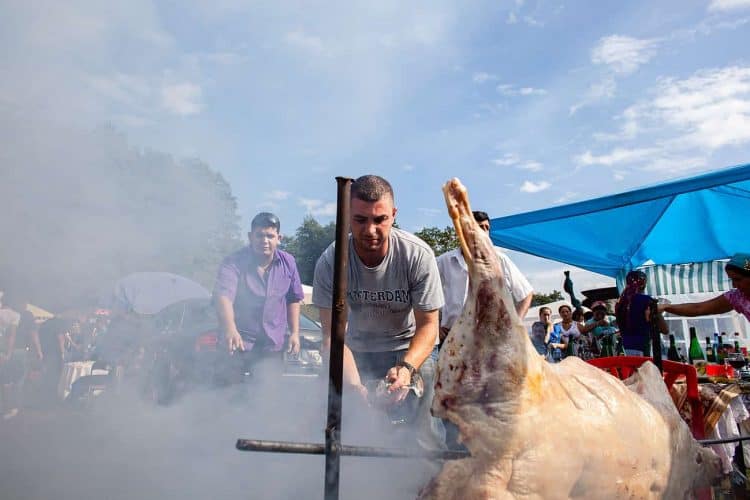 Roma man attending the grill during the traditional ethnic Roma festival in Costesti, 210 km (128 miles) west of Bucharest, September 8, 2011. Following their tradition, thousands of Roma from all over Romania, which has Europe's largest Roma community, gather every year to celebrate the birthday of St. Mary, to make wedding arrangements for their sons and daughters and to show off their wealth.