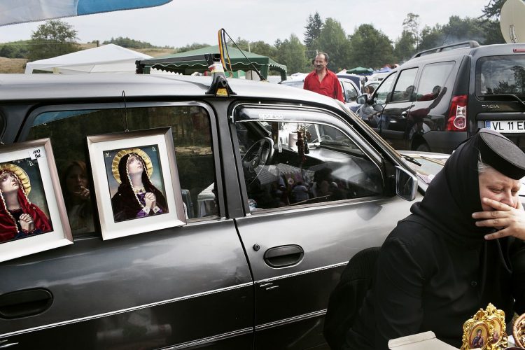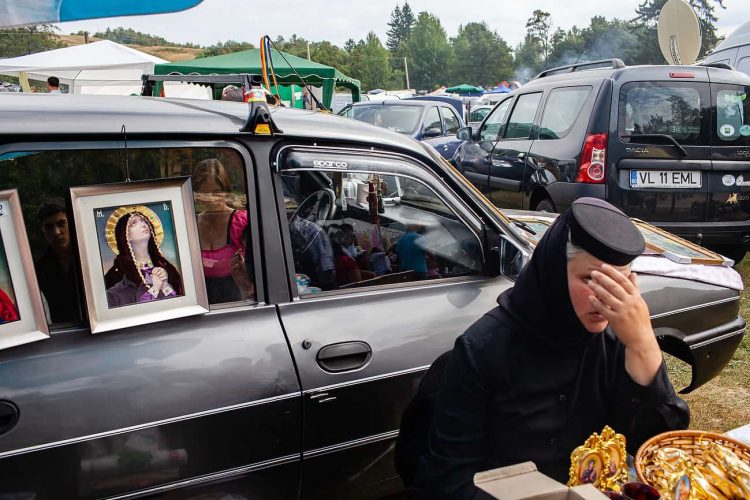 Romanian women, member of the clergy, sells icons during the traditional ethnic Roma festival in Costesti, 210 km (128 miles) west of Bucharest, September 8, 2011. Following their tradition, thousands of Roma from all over Romania, which has Europe's largest Roma community, gather every year to celebrate the birthday of St. Mary, to make wedding arrangements for their sons and daughters and to show off their wealth.